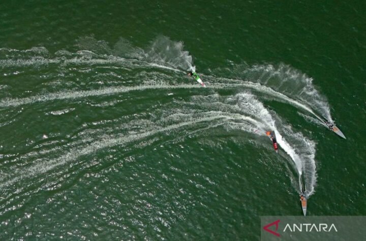 Foto udara peserta memacu kecepatan perahunya saat mengikuti Katinting Race 2025 di Taman Andalan...