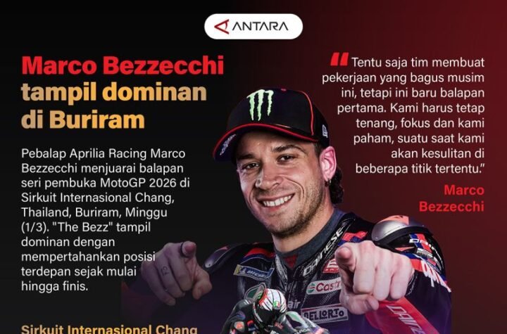 Pebalap Aprilia Racing Marco Bezzecchi menjuarai balapan seri pembuka MotoGP 2026 di Sirkuit Internasional...