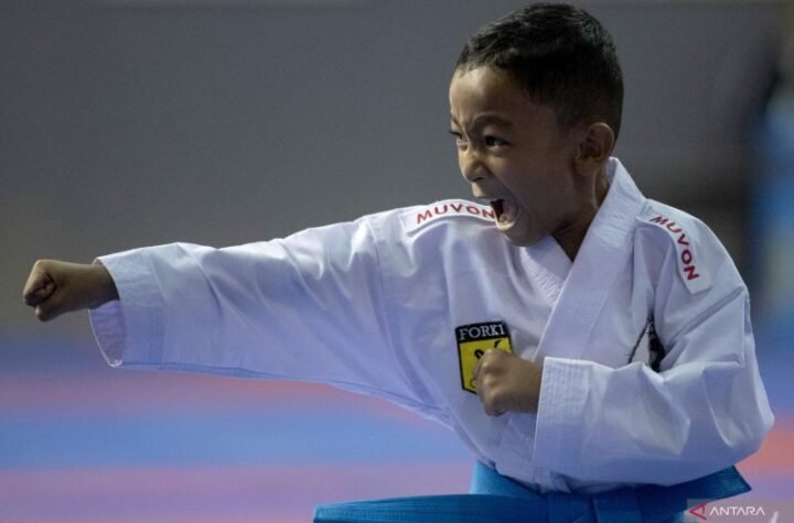 Peserta beraksi pada nomor kata perorangan Kejuaraan Karate Piala Pangdam II/Sriwijaya di Palembang Sport...
