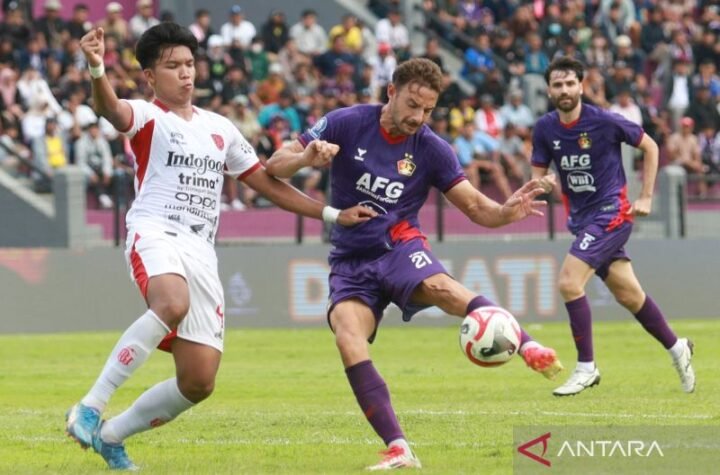Pesepak bola Persik Kediri Jose Enrique Rodriguez (kanan) berebut bola dengan pesepak bola Bali...